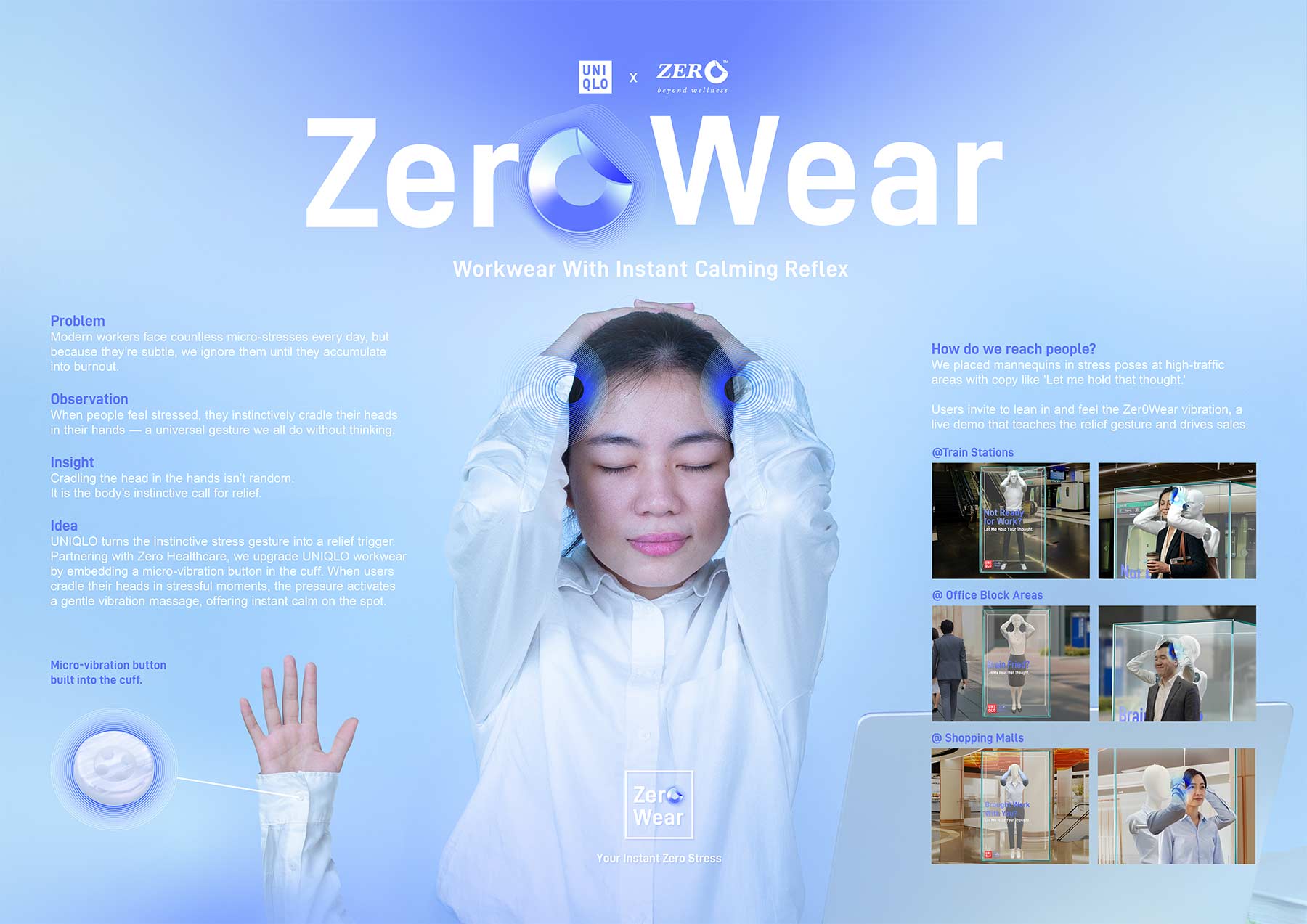 Partnering with Zero Healthcare, we upgrade UNIQLO workwear by embedding a micro-vibration button in the cuff, offering instant calm on the spot.